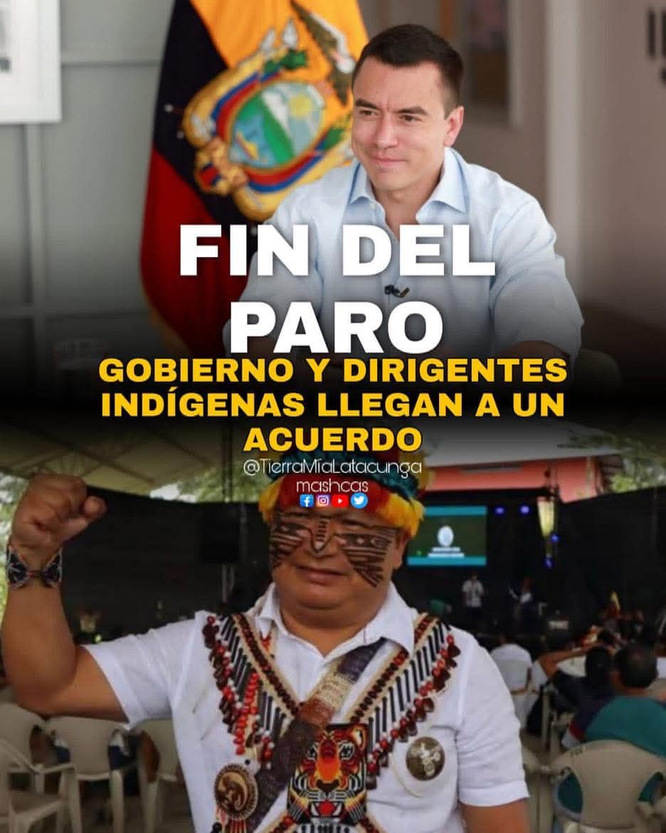¡SE ACABÓ EL PARO! Tras 24 días de protesta, el Ministro de Interior, John Reimberg, y el Bloque de Seguridad, participaron de la Mesa de Diálogo con Organizaciones Indígenas y la mediación de la Iglesia para alcanzar un acuerdo definitivo que puso fin al paro hoy a las 17h29 minutos.