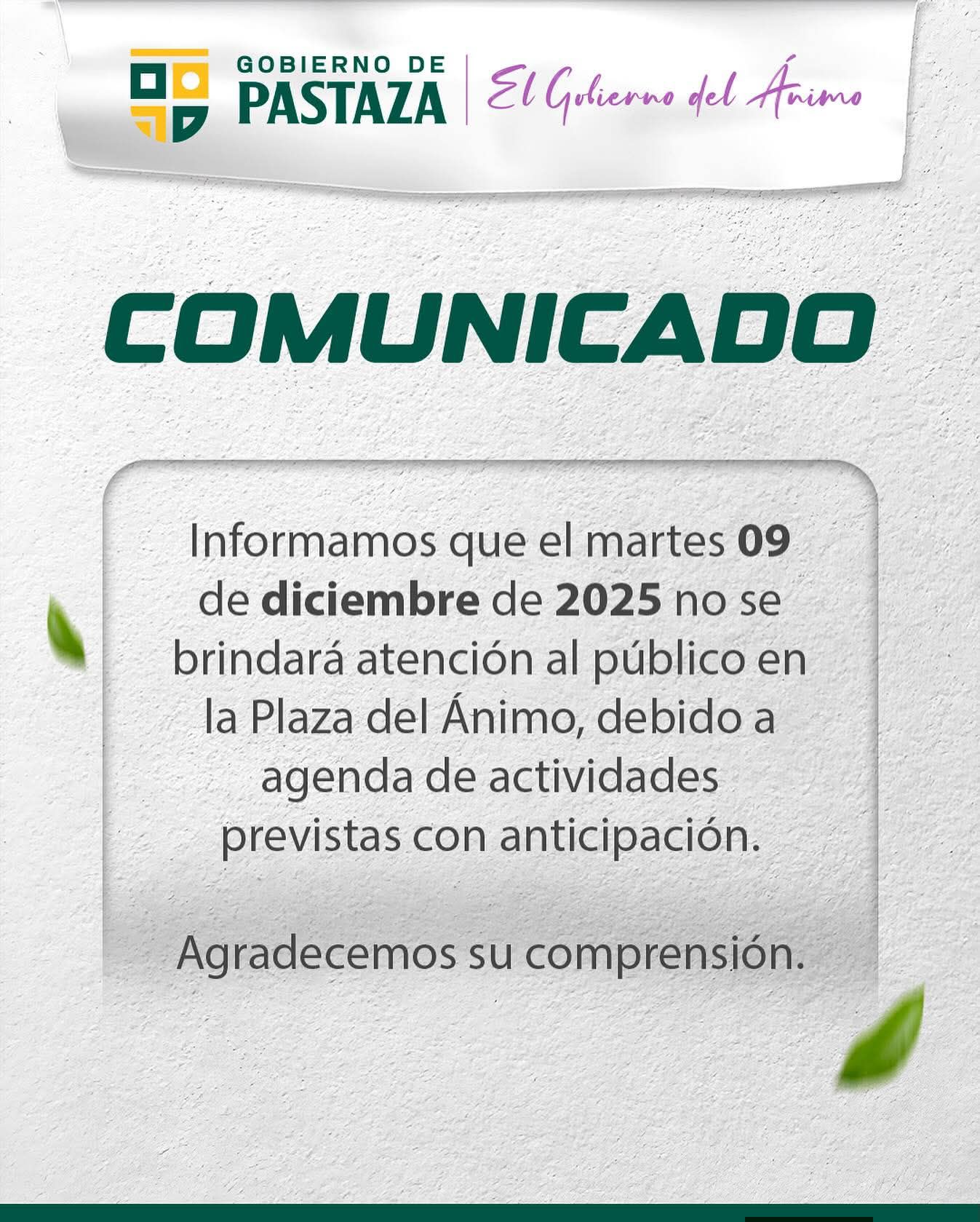 Prefectura de Pastaza informa: (comunicado 1) Este martes no habrá atención al público en la plaza del ánimo diciembre 8, 2025diciembre 8, 2025 notiamazonia