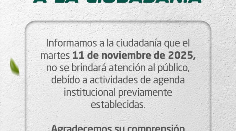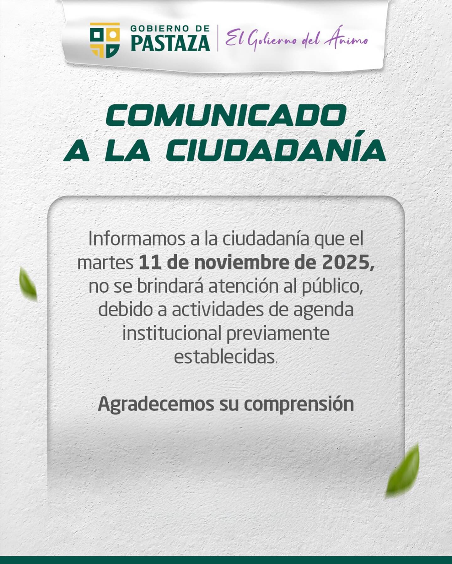 Prefectura de Pastaza informa: (comunicado) este martes 11 de noviembre no habrá atención ciudadana noviembre 10, 2025noviembre 10, 2025 notiamazonia