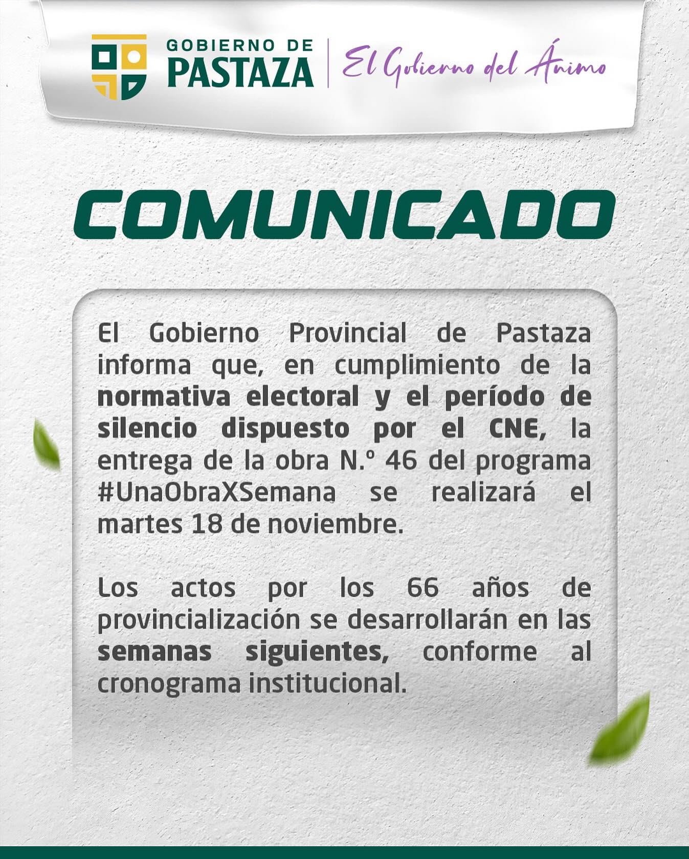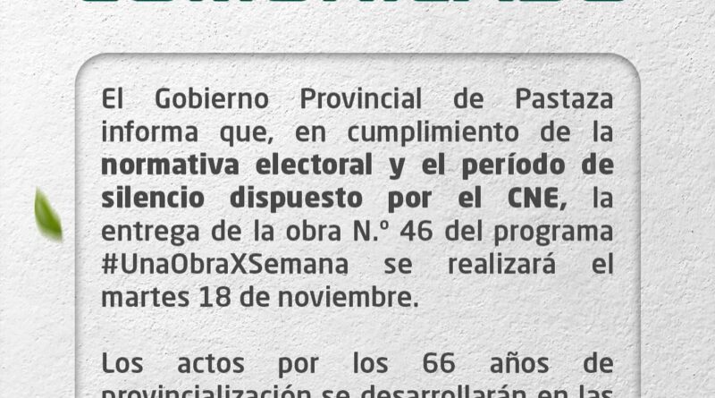 Pastaza (comunicado) La obra por semana se posterga para el próximo martes debido al silencio electoral