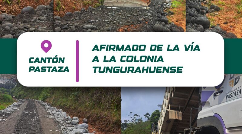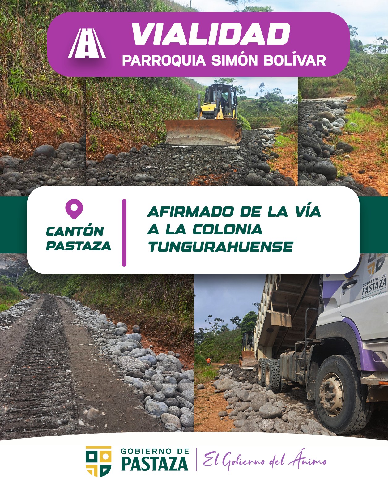 La Prefectura de Pastaza continúa avanzando con el afirmado de la vía hacia la Colonia Tungurahuense**, en la parroquia Simón Bolívar.