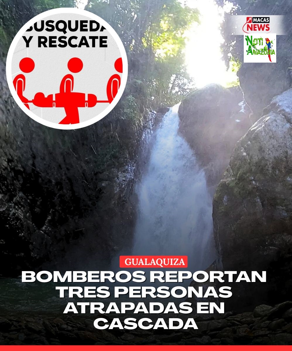 TRES PERSONAS ATRAPADAS EN UNA CASCADA DE #MoronaSantiago FUERON RESCATADAS POR EL CUERPO DE BOMBEROS DE GUALAQUIZA
