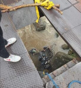 Puente sobre el río Jondachi en la vía Tena a Quito se ha convertido en trampa mortal para los viajeros, al fondo del cauce fue a parar un motociclista al encontrarse con una plancha de tol falsa en la estructura del puente, que se complementa por las presencia de lluvias en al zona que ponen resbalosa le viaducto con tremendo hueco en su trayecto.