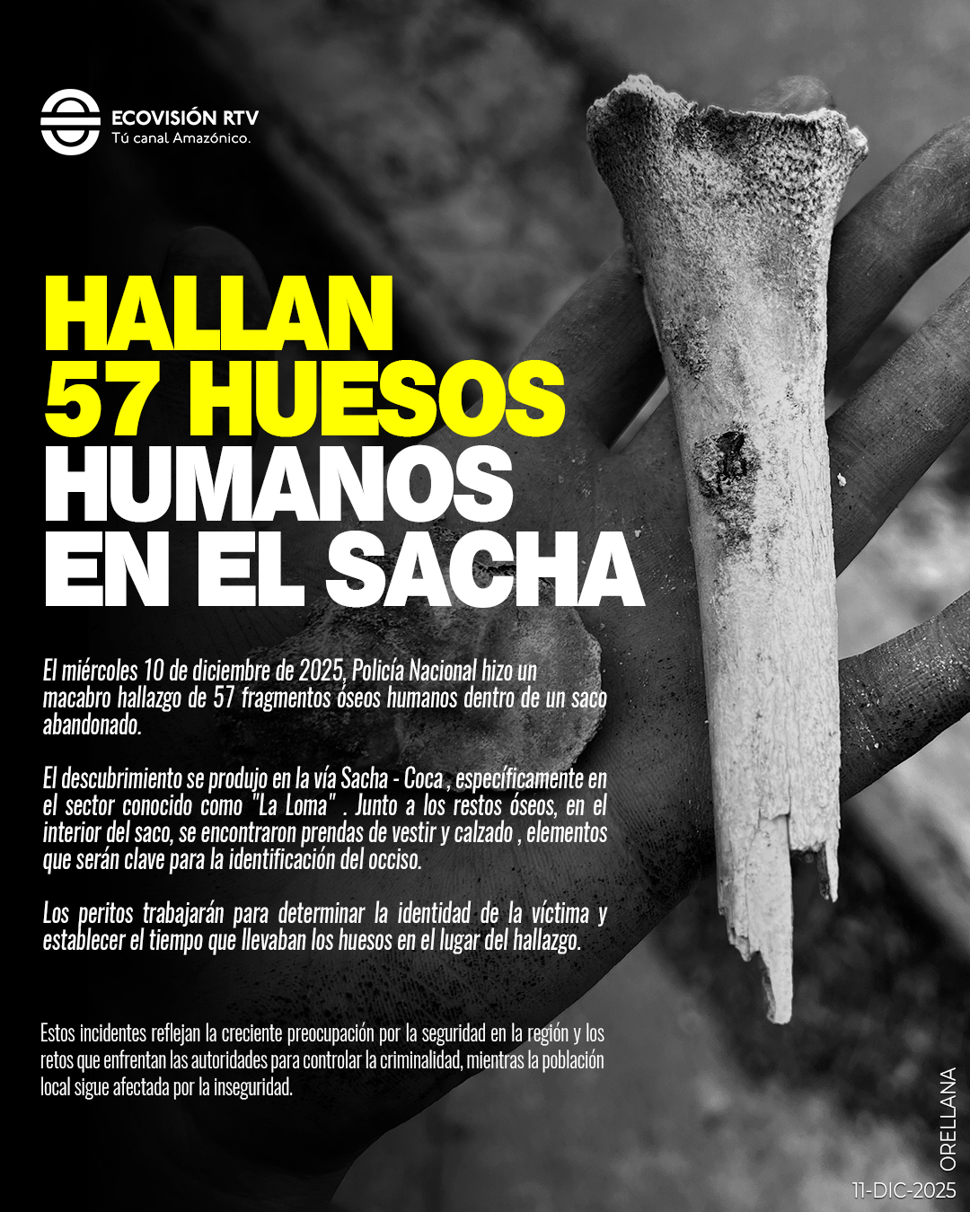 El descubrimiento se produjo en la vía Sacha – Coca , específicamente en el sector conocido como «La Loma» . Junto a los restos óseos, en el interior del saco, se encontraron prendas de vestir y calzado, elementos que serán clave para la identificación del occiso.