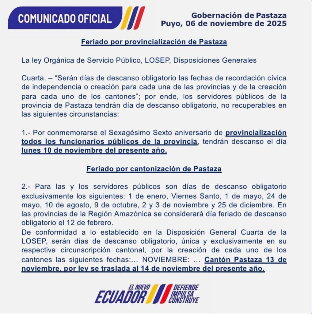 Regional Pastaza: el lunes 10 de noviembre será feriado en toda la provincia y el viernes 14 de noviembre feriado en el Cantón Pastaza. noviembre 6, 2025noviembre 6, 2025 notiamazonia