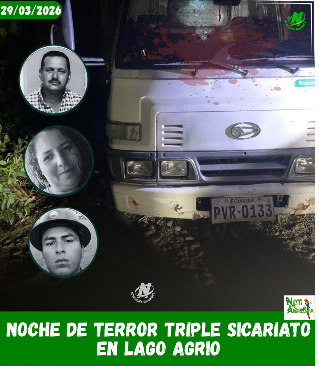 Noche de terror triple sicariato en Lago agrio. Lo que parecía una jornada normal terminó en tragedia. En el sector Valle Hermoso parroquia General Farfán un camión que transportaba ganado fue interceptado y convertido en escena de muerte.