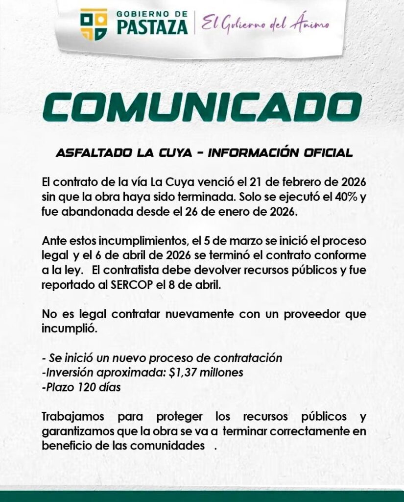 Uncategorized comunicado: prefectura de Pastaza emitió comunicado frente a medida de cierre de la vía por parte de comuneros de Canelos abril 17, 2026 notiamazonia